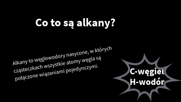 Alkany to węglowodory nasycone, w których cząsteczkach wszystkie atomy węgla są połączone wiązaniami pojedynczymi.