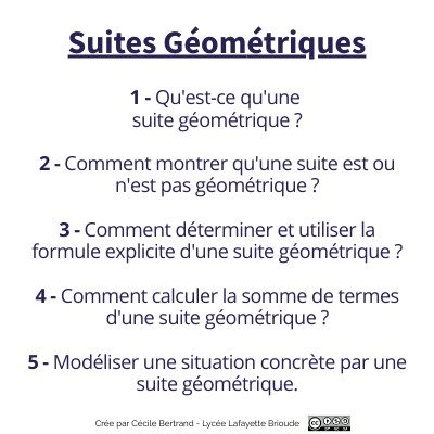Une suite géométrique est une suite dont chaque terme est obtenu en multipliant le terme précédent par un même nombre (appelé la raison). Une suite géométrique (un) de raison q est donc définie par son premier terme et par la relation de récurrence un+1 = un × q.