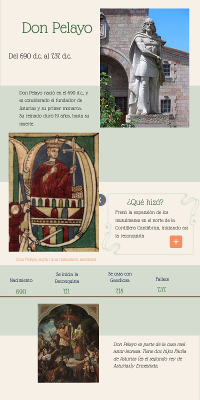 Don Pelayo nació en el 690 d.c., y es considerado el fundador de Asturias y su primer monarca.Su reinado duró 19 años, hasta su muerte.