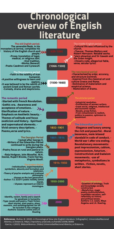 References -Muñoz, M. (2020). A Chronological View into English Literature. [Infographic]. UniversidadNacional Abierta y a Distancia. https://repository.unad.edu.co/handle/10596/36808 -Garcia, J.(2023). Webconference. (Video) UniversidadNacional Abierta y a Distancia.