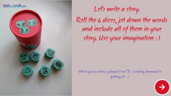 Roll the 6 dices, jot down the words and include all of them in your story. Use your imagination : )