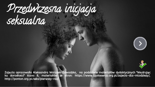 Zajęcia opracowała Aleksandra Walasek-Zawadzka, na podstawie materiałów dydaktycznych "Wędrując ku dorosłości" klasa 8, materiałów ze stron: https://www.czysteserca.org.pl/zajecia-dla-mlodziezy/, http://ponton.org.pl/seks/pierwszy-raz/