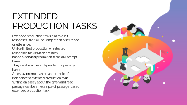 Extended production tasks aim to elicit responses that will be longer than a sentence or utterance.Unlike limited production or selected responses tasks which are item-based,extended production tasks are prompt-based. They can be either independent or passage-based. An essay prompt can be an example of independent extented production task. Writing an essay about the given and read passage can be an example of passage-based extended production task.