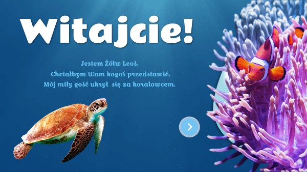 Jestem Żółw Leoś. Chciałbym Wam kogoś przedstawić. Mój miły gość ukrył się za koralowcem.
