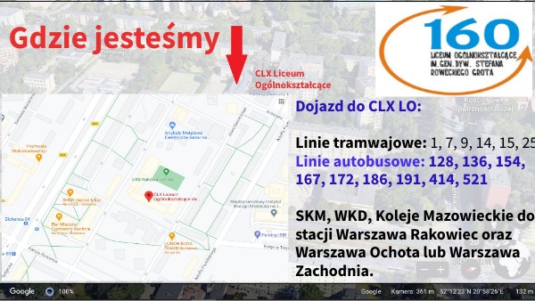 Dojazd do CLX LO: Linie tramwajowe: 1, 7, 9, 14, 15, 25 Linie autobusowe: 128, 136, 154, 167, 172, 186, 191, 414, 521 SKM, WKD, Koleje Mazowieckie do stacji Warszawa Rakowiec oraz Warszawa Ochota lub Warszawa Zachodnia.