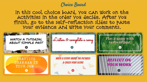 In this cool choice board, you can work on the activities in the order you decide. After you finish, go to the self-reflection slides to paste your evidence and write your comments.