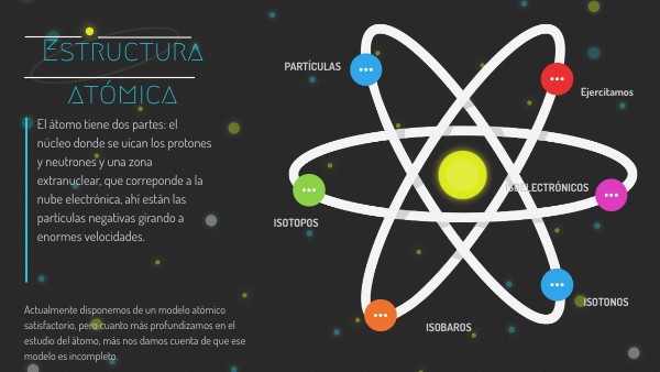 El átomo tiene dos partes: el núcleo donde se uican los protones y neutrones y una zona extranuclear, que correponde a la nube electrónica, ahí están las partículas negativas girando a enormes velocidades.