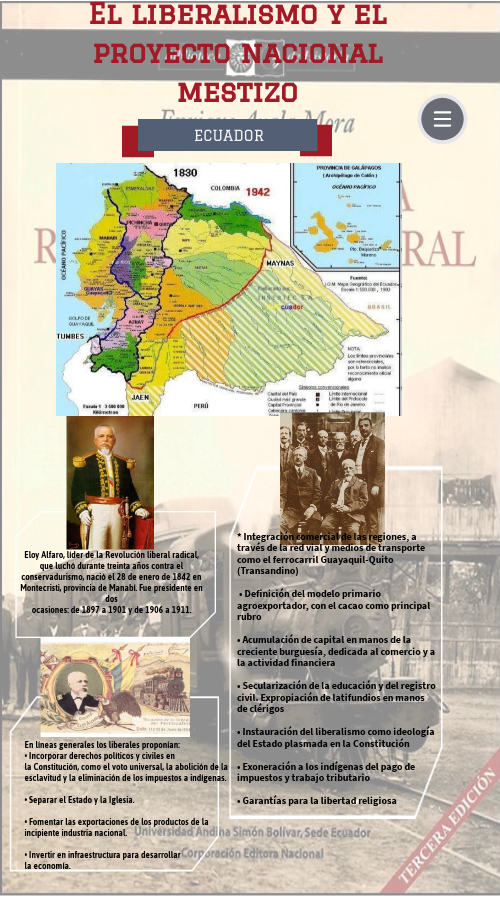 * Integración comercial de las regiones, a través de la red vial y medios de transporte como el ferrocarril Guayaquil-Quito (Transandino) • Definición del modelo primario agroexportador, con el cacao como principal rubro • Acumulación de capital en manos de la creciente burguesía, dedicada al comercio y a la actividad financiera • Secularización de la educación y del registro civil. Expropiación de latifundios en manos de clérigos • Instauración del liberalismo como ideología del Estado plasmada en la Constitución • Exoneración a los indígenas del pago de impuestos y trabajo tributario • Garantías para la libertad religiosa