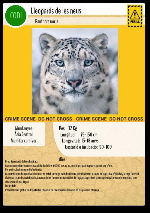 Breu descripció del seu hàbitat :Viuen en muntanyes remotes a altituds de fins a 6000 m s. n. m., motiu pel qual és poc el que se sap d'ells. Per què es troba en perill d'extinció: La quantitat de lleopards de les neus en estat salvatge està disminuint principalment a causa de la pèrdua d'hàbitat, la caça furtiva i els impactes de l'canvi climàtic. A causa de les formes insostenibles de caça, està perdent la seva principal presa: els ungulats, com l'Ibex siberià o el Argali. Curiositat: L'escalfament global podria afectar l'hàbitat de l'lleopard de les neus en els propers 50 anys.