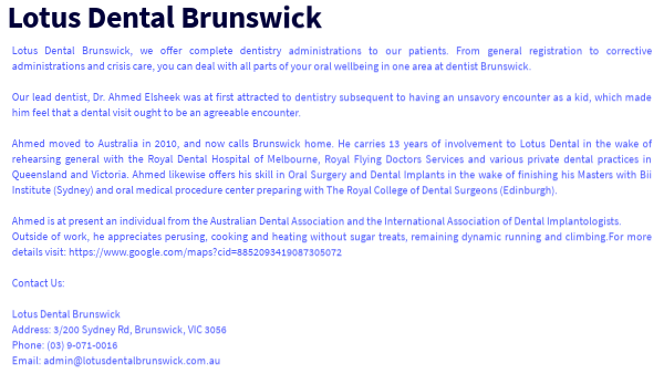 Lotus Dental Brunswick, we offer complete dentistry administrations to our patients. From general registration to corrective administrations and crisis care, you can deal with all parts of your oral wellbeing in one area at dentist Brunswick. Our lead dentist, Dr. Ahmed Elsheek was at first attracted to dentistry subsequent to having an unsavory encounter as a kid, which made him feel that a dental visit ought to be an agreeable encounter. Ahmed moved to Australia in 2010, and now calls Brunswick home. He carries 13 years of involvement to Lotus Dental in the wake of rehearsing general with the Royal Dental Hospital of Melbourne, Royal Flying Doctors Services and various private dental practices in Queensland and Victoria. Ahmed likewise offers his skill in Oral Surgery and Dental Implants in the wake of finishing his Masters with Bii Institute (Sydney) and oral medical procedure center preparing with The Royal College of Dental Surgeons (Edinburgh). Ahmed is at present an individual from the Australian Dental Association and the International Association of Dental Implantologists. Outside of work, he appreciates perusing, cooking and heating without sugar treats, remaining dynamic running and climbing.For more details visit: https://www.google.com/maps?cid=8852093419087305072 Contact Us: Lotus Dental Brunswick Address: 3/200 Sydney Rd, Brunswick, VIC 3056 Phone: (03) 9-071-0016 Email: admin@lotusdentalbrunswick.com.au