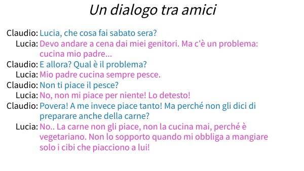 Lucia, che cosa fai sabato sera? Devo andare a cena dai miei genitori. Ma c'è un problema: cucina mio padre... E allora? Qual è il problema? Mio padre cucina sempre pesce. Non ti piace il pesce? No, non mi piace per niente! Detesto il pesce! Povera! A me invece piace tanto! Ma perché non dici a tuo padre di preparare anche della carne? No.. La carne non piace a mio padre, lui non cucina mai la carne, perché è vegetariano. Non sopporto mio padre quando mi obbliga a mangiare solo i cibi che piacciono a mio padre!