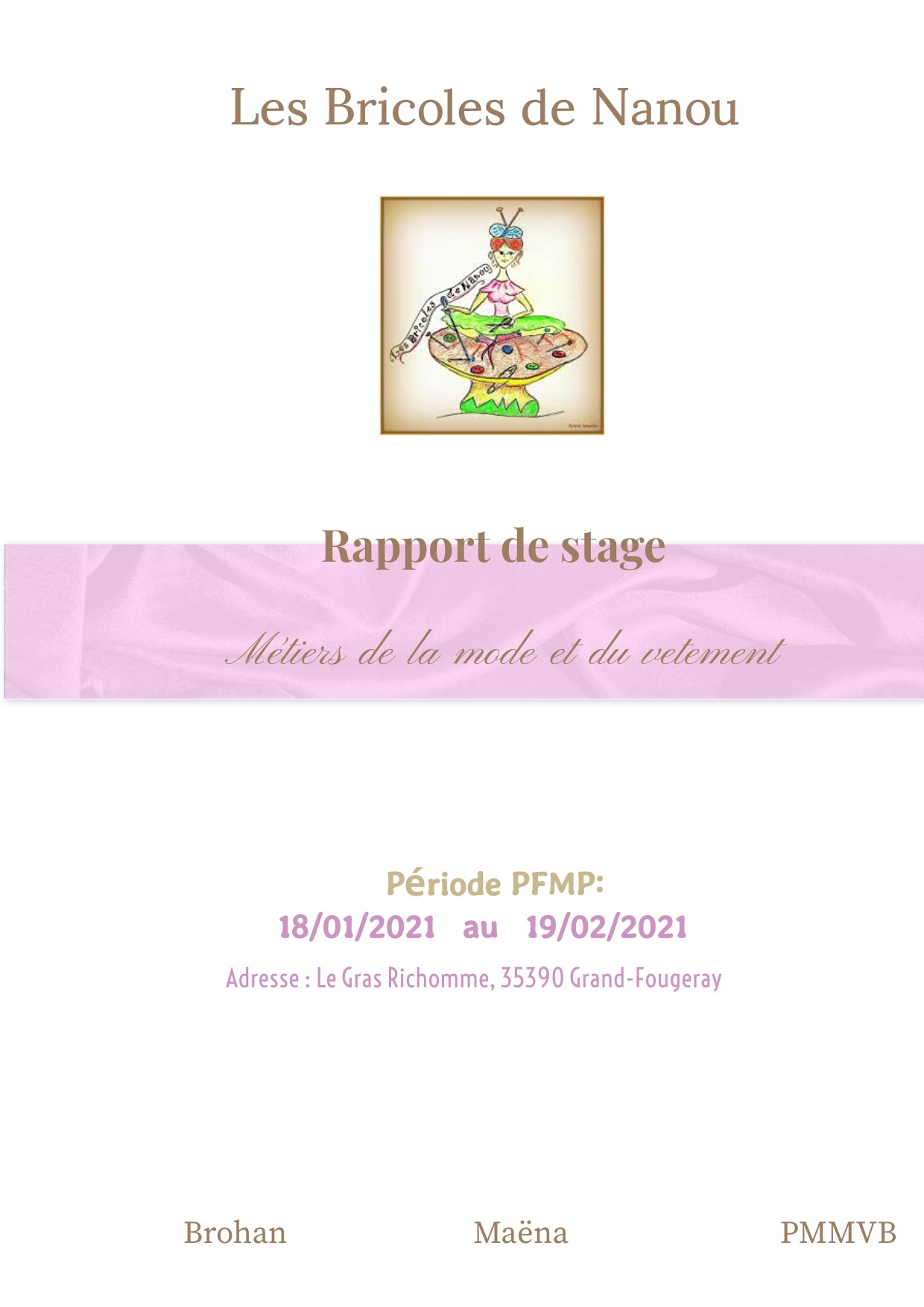 Je m'appelle Maëna Brohan je suis en deuxième année de baccalauréat professionnel métiers de la mode et du vêtement au Lycée des métiers Louis Guilloux, j'ai effectué mon stagedu 18 janvier au 19 février 2021 au sein de l'entriprise " Les bricoles de nanou" du 18 sitié au lieu dit "Le Gras Richomme" J'ai choisi cette entreprise car elle est gérée par une auto-entrepreneuse et qu'elle adopte une démarche éco-responsable. Cette expérience pratique m' a donné l'opportunité de découvrir comment gérer un site web, les réseaux sociaux, concevoir divers produits et d'assurer des cours de couture. Ce stage m'a permis de concretiser mes choix pour mon avenir professionnel. J'ai pu prendre confiance en moi . J'ai crée diverses pièces de coutures ce qui m'a permis de progresser . Pou mon avenir ,je souhaite créer des vêtements pour avoir le plaisir de les voir porter.