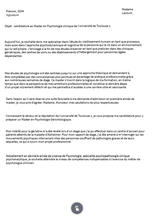 Connaissant le sérieux et la réputation de l'université de Toulouse 1, je vous propose ma candidature pour y préparer un Master en Psychologie Gérontologique.