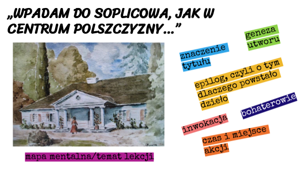 miejsce akcji = na Litwie (w fikcyjnym Soplicowie, majątku szlacheckim, niedaleko niego znajduje się zamek Horeszków, karczma, zaścianek szlachecki Dobrzyn) czas akcji = lato 1811 r. (5 dni) i wiosna 1812 r. (1 dzień)