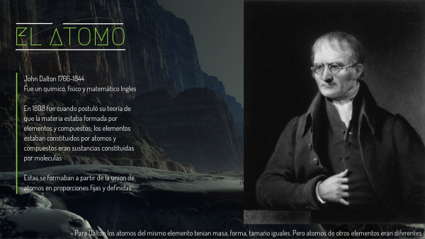 John Dalton 1766-1844Fue un químico, físico y matemático InglesEn 1808 fue cuando postuló su teoría de que la materia estaba formada por elementos y compuestos; los elementos estaban constituidos por atomos y compuestos eran sustancias constituidas por moleculas Estas se formaban a partir de la union de atomos en proporciones fijas y definidas