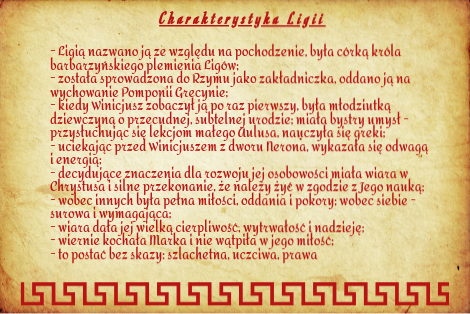 - Ligią nazwano ją ze względu na pochodzenie, była córką króla barbarzyńskiego plemienia Ligów; - została sprowadzona do Rzymu jako zakładniczka, oddano ją na wychowanie Pomponii Grecynie; - kiedy Winicjusz zobaczył ją po raz pierwszy, była młodziutką dziewczyną o przecudnej, subtelnej urodzie; miała bystry umysł - przysłuchując się lekcjom małego Aulusa, nauczyła się greki; - uciekając przed Winicjuszem z dworu Nerona, wykazała się odwagą i energią; - decydujące znaczenia dla rozwoju jej osobowości miała wiara w Chrystusa i silne przekonanie, że należy żyć w zgodzie z Jego nauką; - wobec innych była pełna miłości, oddania i pokory; wobec siebie - surowa i wymagająca; - wiara dała jej wielką cierpliwość, wytrwałość i nadzieję; - wiernie kochała Marka i nie wątpiła w jego miłość; - to postać bez skazy: szlachetna, uczciwa, prawa