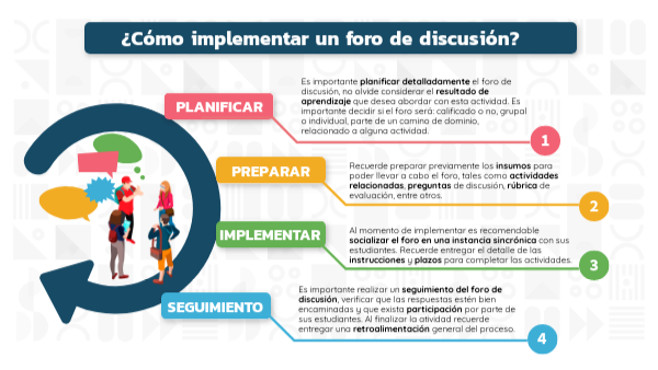 Recuerde preparar previamente los insumos para poder llevar a cabo el foro, tales como actividades relacionadas, preguntas de discusión, rúbrica de evaluación, entre otros.
