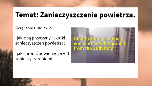 Czego się nauczysz: -jakie są przyczyny i skutki zanieczyszczeń powietrza; -jak chronić powietrze przed zanieczyszczeniami;