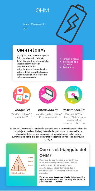 La Ley de Ohm muestra la relación que existe entre una resistencia, la tensión o voltaje en sus terminales y la corriente que pasa a través de ella. La intensidad de la corriente en un circuito eléctrico es igual al voltaje suministrado por la pila dividido por la resistencia existente en el circuito: V = I / R