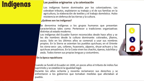 Se denomina indígenas a los grupos humanos que presentan características tales como: Pertenecer a tradiciones organizativas distintas al estado moderno.Los indígenas del Ecuador fueron reconocidos desde hace años y se les dio nombres desde la cultura dominante: colorados, jíbaros, aucas. Solo en los últimos años se comenzó a usar sus nombres propios. En la Sierra se asientan los pueblos quichuas; en el Oriente los siona-seco- yas, cofanes, huaoranis, záparos, shuar-achuars y los quichuas amazónicos. En la Costa viven los chachis, éperas, tsáchilas y awás. Todos tienen sus propias lenguas y costumbres.