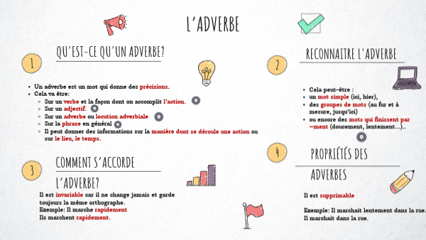 - ou encore des mots qui finissent par –ment (doucement, lentement...)..