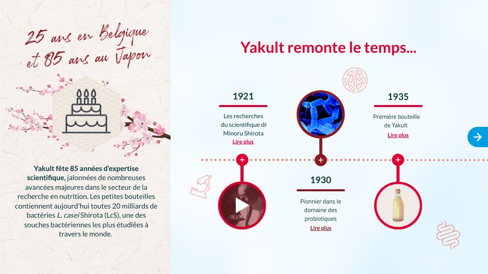 Yakult fête 85 années d’expertise scientifique, jalonnées de nombreuses avancées majeures dans le secteur de la recherche en nutrition. Les petites bouteilles contiennent aujourd’hui toutes 20 milliards de bactéries L. casei Shirota (LcS), une des souches bactériennes les plus étudiées à travers le monde.