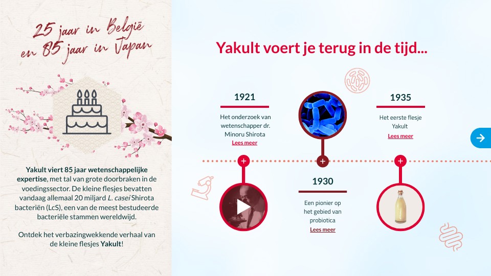 Yakult viert 85 jaar wetenschappelijke expertise, met tal van grote doorbraken in de voedingssector. De kleine flesjes bevatten vandaag allemaal 20 miljard L. casei Shirota bacteriën (LcS), een van de meest bestudeerde bacteriële stammen wereldwijd.Ontdek het verbazingwekkende verhaal van de kleine flesjes Yakult!