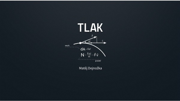 Značka - pZákladní jednotka - Pascal (Pa) Představa jednotky 1Pa …hmotnost 100 g na 1 m2 Dělí se na tlak mechanický, atmosférický a hydrostatický Vzorce: Tlak mechanický - p= F:S Tlak atmosférický - pa= h.ro(vzduchu).g Tlak hydrostatický - ph= h.ro(kapaliny).g Používané jednotky : 1GPa 1000 1MPa 1000 1KPa 10 1hPa 100 1Pa