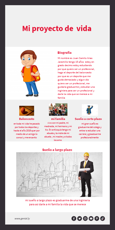Mi nombre es Juan Camilo Arias Jaramillo tengo 15 años estoy en grado decimo estoy estudiando por que quiero ser un profesional, hago el deporte del baloncesto por que es un deporte que me gusta demasiado y algun dia quiero ser un profesional, me gustaria graduarme y estudiar una inginiera para ser un profesional y darle la vida que se merece a mi familia