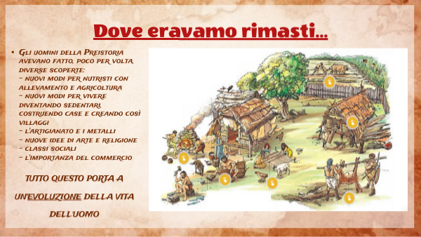 - Gli uomini della Preistoria avevano fatto, poco per volta, diverse scoperte:- nuovi modi per nutristi con allevamento e agricoltura- nuovi modi per vivere diventando sedentari, costruendo case e creando così villaggi- l'artigianato e i metalli- nuove idee di arte e religione- classi sociali - l'importanza del commercio