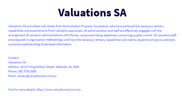 Valuations SA just utilize individuals from the Australian Property Foundation, who have achieved the necessary tertiary capabilities and experience to finish valuation appraisals. All administration and staff are effectively engaged with the arrangement of valuation administrations with the key component being steadiness concerning quality control. All valuation staff are prepared in organization methodology and have the necessary tertiary capabilities and nearby experience to give customers a precise understanding of stamped information. Contact: Valuations SA Address: 10/117 King William Street, Adelaide, SA, 5000 Phone: (08) 7078 3538 Email: valuers@valuationssa.com.au Visit for more details: https://www.valuationssa.com.au