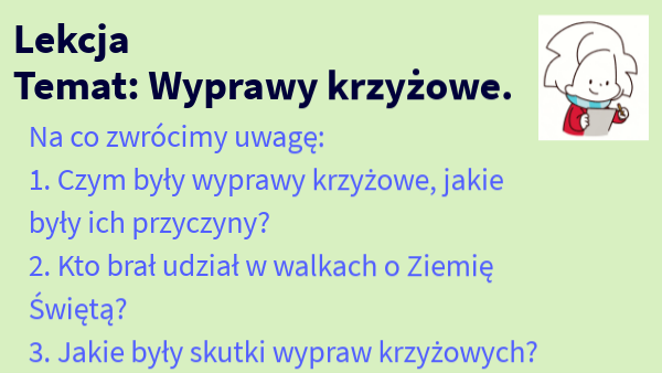 Na co zwrócimy uwagę: 1. Czym były wyprawy krzyżowe, jakie były ich przyczyny? 2. Kto brał udział w walkach o Ziemię Świętą? 3. Jakie były skutki wypraw krzyżowych?