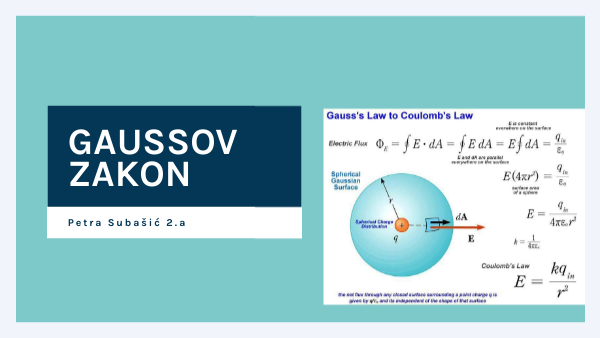 - Gaussov zakon glasi: "Ukupni električni tok kroz zatvorenu plohu je proporcionalan ukupnom naboju sadržanom unutar te plohe." Možemo ga koristiti u integralnom i diferencijalnom obliku