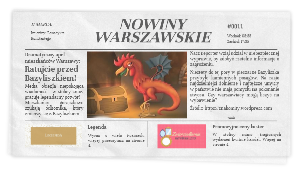 Nasz reporter wziął udział w niebezpiecznej wyprawie, by zdobyć rzetelne informacje o zagrożeniu. Niestety do tej pory w pieczarze Bazyliszka przybyło kamiennych posągów. Na razie najdzielniejsi żołnierze i najtęższe umysły w państwie nie mają pomysłu na pokonanie stwora. Czy warszawiacy mogą liczyć na wybawienie? Źródło:https://znakomity.wordpress.com