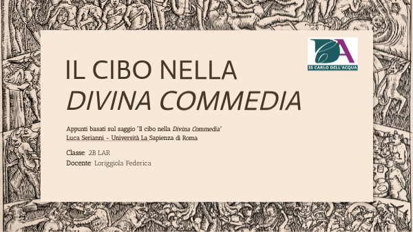 Il presente lavoro serve come introduzione al mondo dantesco in occasione del settecentesimo anniversario della morte del poeta, avvanuta a Ravenna nel 1321. Il testo dantesco verrà analizzato solo in un piccolo aspetto tematico, ossia il modo in cui viene rappresentato il cibo nella Divina commedia. Questo percorso servirà come punto di partenza per la realizzazione di un prodotto multimediale da inserire nelle manifestazioni per la "Settimana della lingua italiana nel mondo" organizzate dal Cosolato Geenerale di Italia a Miami