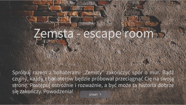 Spróbuj razem z bohaterami „Zemsty” zakończyć spór o mur. Bądź czujny, każdy z bohaterów będzie próbował przeciągnąć Cię na swoją stronę. Postępuj ostrożnie i rozważnie, a być może ta historia dobrze się zakończy. Powodzenia!