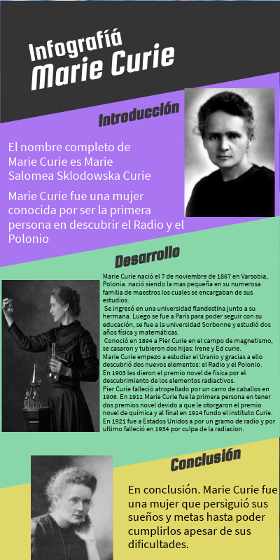 En conclusión. Marie Curie fue una mujer que persiguió sus sueños y metas hasta poder cumplirlos apesar de sus dificultades.