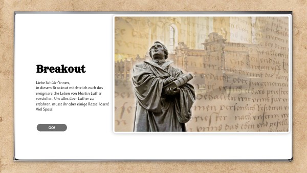 Liebe Schüler*innen, in diesem Breakout möchte ich euch das ereignisreiche Leben von Martin Luther vorstellen. Um alles über Luther zu erfahren, müsst ihr aber einige Rätsel lösen! Viel Spass!