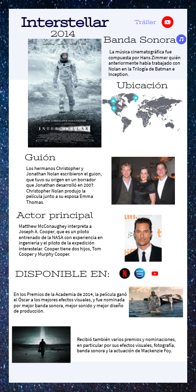 Matthew McConaughey interpreta a Joseph A. Cooper, que es un piloto entrenado de la NASA con experiencia en ingeniería y el piloto de la expedición interestelar. Cooper tiene dos hijos, Tom Cooper y Murphy Cooper.