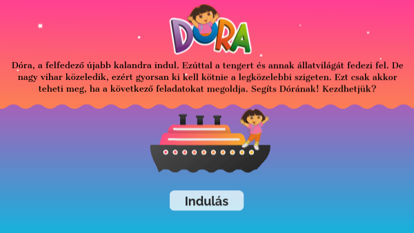 Dóra, a felfedező újabb kalandra indul. Ezúttal a tengert és annak állatvilágát fedezi fel. De nagy vihar közeledik, ezért gyorsan ki kell kötnie a legközelebbi szigeten. Ezt csak akkor teheti meg, ha a következő feladatokat megoldja. Segíts Dórának! Kezdhetjük?