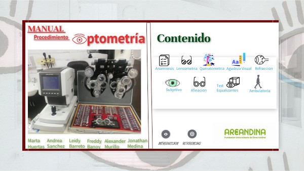 Para la realización de este manual de optometría se recolectan insumos teóricos, desde el rol de estudiante en la carrera de optometría, contiene información detallada completa como una ayuda para facilitar el aprendizaje y la actualización en aspectos relevantes y referentes a la optometría, tanto para el profesional como para el estudiante.