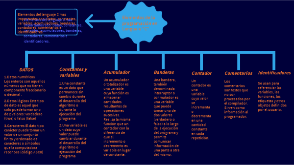 Elementos del lenguaje C mas importantes son: Datos, constantes, variables, acumuladores, banderas, contadores, comentarios e identificadores.