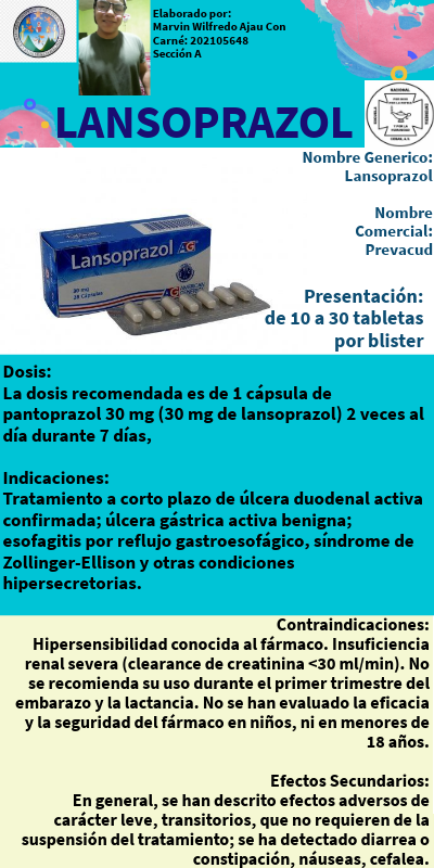 Nombre Generico:Lansoprazol Nombre Comercial: Prevacud