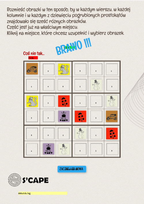 Rozmieść obrazki w ten sposób, by w każdym wierszu, w każdej kolumnie i w każdym z dziewięciu pogrubionych prostokątów znajdowało się sześć różnych obrazków.Część jest już na właściwym miejscu.Kliknij na miejsce, które chcesz uzupełnić i wybierz obrazek.