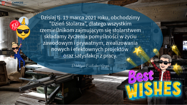 Dzisiaj tj. 19 marca 2021 roku, obchodzimy "Dzień Stolarza", dlatego wszystkim rzemieślnikom zajmującym się stolarstwem składamy życzenia pomyślności w życiu zawodowym i prywatnym, zrealizowania nowych i efektownych projektów oraz satysfakcji z pracy.