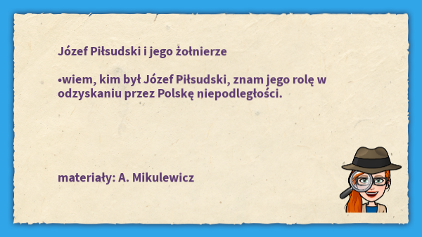 Józef Piłsudski i jego żołnierze •wiem, kim był Józef Piłsudski, znam jego rolę w odzyskaniu przez Polskę niepodległości. materiały: A. Mikulewicz