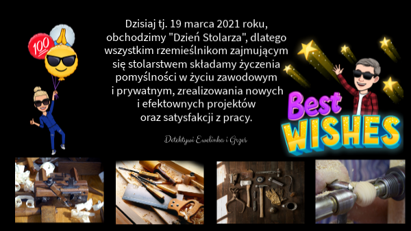 Dzisiaj tj. 19 marca 2021 roku, obchodzimy "Dzień Stolarza", dlatego wszystkim rzemieślnikom zajmującym się stolarstwem składamy życzenia pomyślności w życiu zawodowym i prywatnym, zrealizowania nowych, efektownych projektów oraz satysfakcji z pracy.