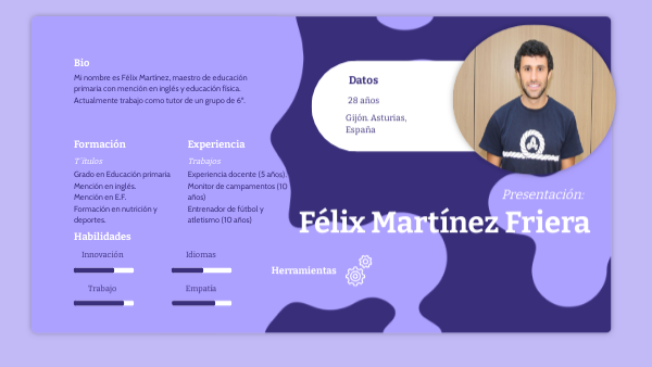Mi nombre es Félix Martínez, maestro de educación primaria con mención en inglés y educación física. Actualmente trabajo como tutor de un grupo de 6º.