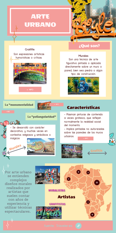 - Plasman pinturas de contenido a veces grotesco, que reflejan normalmente la realidad social del momento.- Implica pintadas no autorizadas sobre las paredes de los muros urbanos.