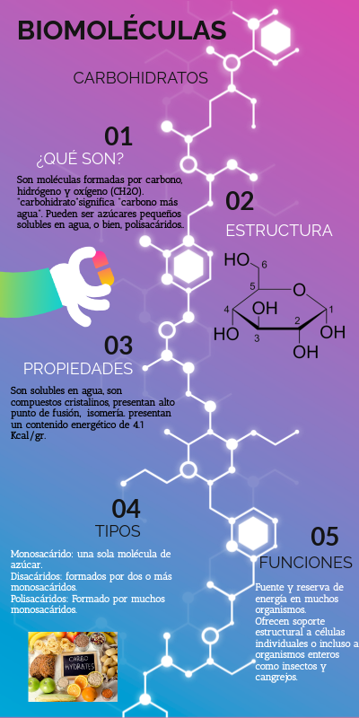 Son moléculas formadas por carbono, hidrógeno y oxígeno (CH2O). “carbohidrato”significa “carbono más agua”. Pueden ser azúcares pequeños solubles en agua, o bien, polisacáridos..